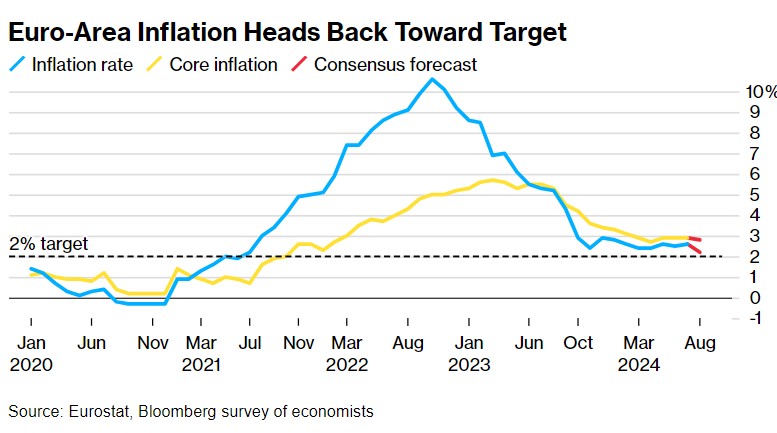 根据机构汇编的经济学家预测数据,周五的数据可能将显示欧元区8月份的通货膨胀率从上个月的2.6%大幅放缓至2.2%。欧洲央行在最新一次经济展望中预计到2025年底才能持续恢复到2%的这一通胀目标,并认为抗通胀前景存在很多不确定性。